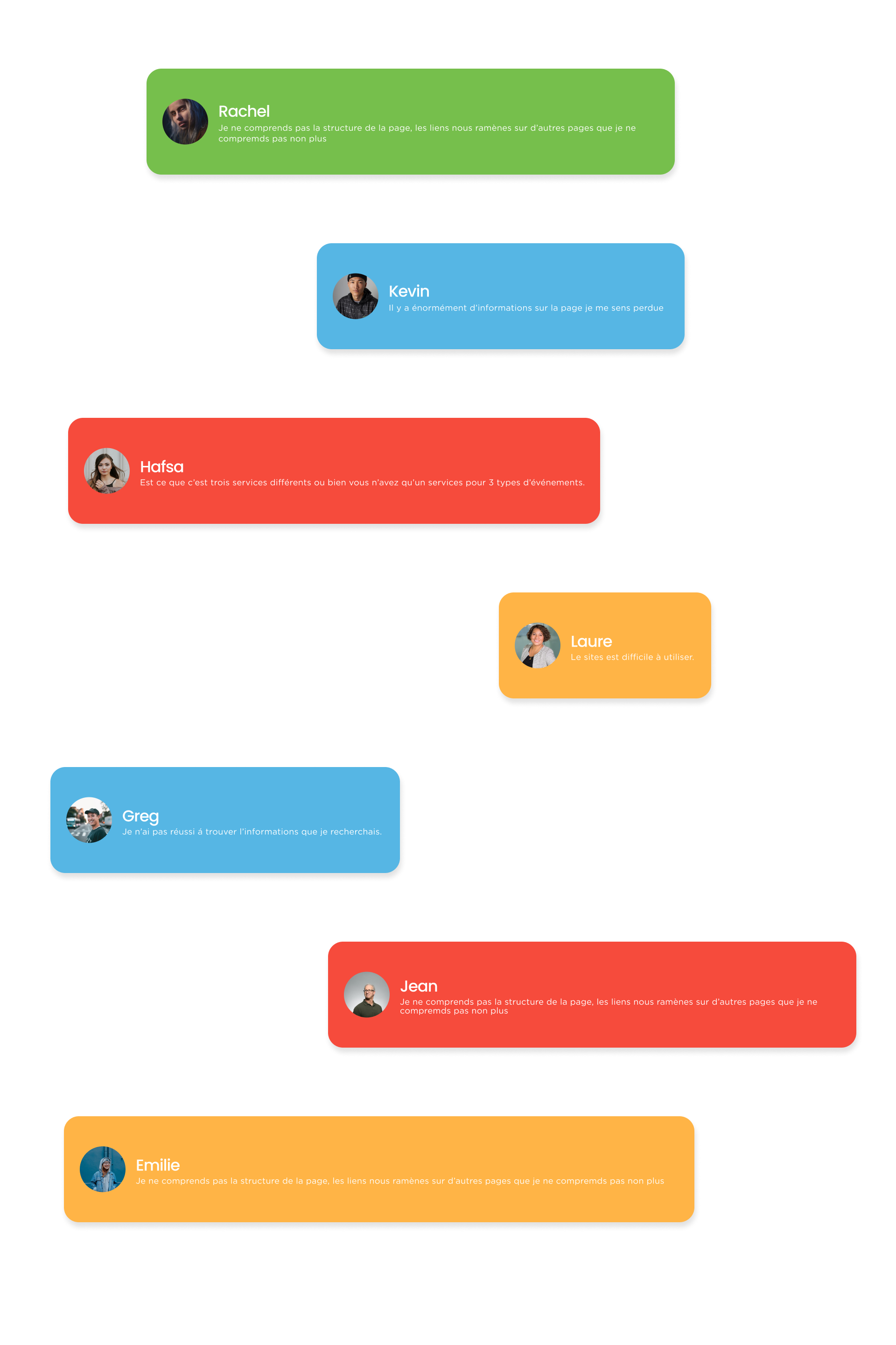 Avec les données recueillis par Josh, une analyse compétitive sur le secteurs de l'évenementiel, ainsi que des guerilla test réalisée avec le design actuel du site, nous avons pu recueillir des données pertinante :